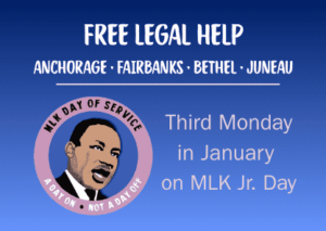 On Martin Luther King Jr. Day, which falls on the third Monday in January each year, the Alaska Bar Association and its partners host MLK Day free legal help clinics at locations throughout Alaska. In 2026, clinics were held in Anchorage, Bethel, Fairbanks, and Juneau. Check this page in early January for updates about the location and times of the next clinic.