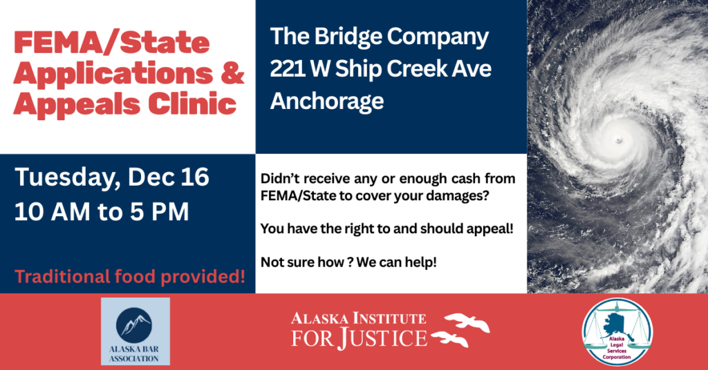 On Tuesday, December 16, 2025 from 10 AM to 5 PM, a free legal clinic will be held in Anchorage to assist evacuees impacted by the Western Alaska storms. Volunteer attorneys will meet with clients for 1-2 hours to advise and assist evacuees in appealing FEMA and state decisions on individual assistance, and related services. Traditional food will be served. The event will be held at the Bridge Company, 221 W. Ship Creek Ave. in Anchorage, next door to the Wingate Hotel in Ship Creek. We are working on getting free shuttle services from the other evacuee hotels. Check back here for updates.
