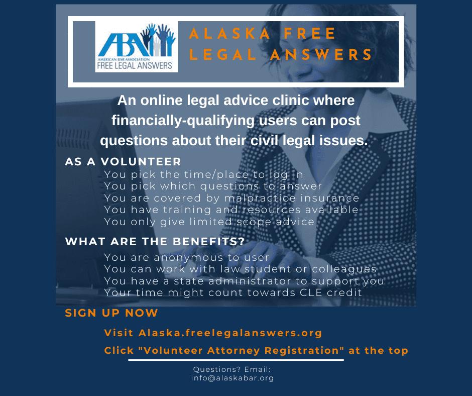 Alaska Free Legal Answers: Offered in partnership with the American Bar Association, Alaska Free Legal Answers is a virtual legal advice clinic in which qualifying users post civil legal questions to be answered by attorneys licensed in Alaska for free. Available 24/7 and 365 days per year, this website allows low-income Alaskans to ask three non-criminal legal questions a year. Volunteer attorneys take, on average, 20 minutes to anonymously answer each question. Questions may be previewed before committing to answering and may be answered on your own schedule. Register here to volunteer. To request Alaska Free Legal Answers cards to hand out to potential clients, please email info@alaskabar.org.