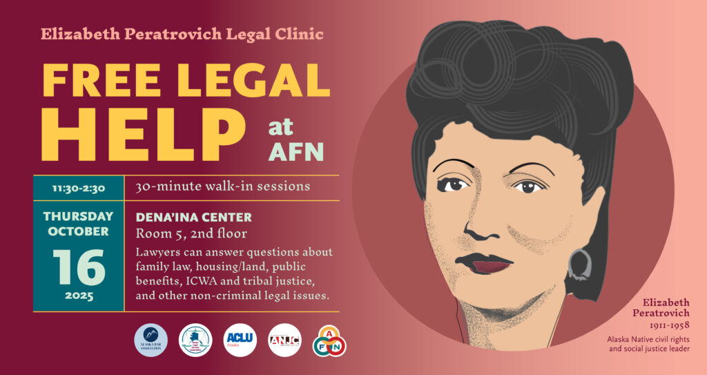 Elizabeth Peratrovich Legal Clinic: On Thursday, October 16, 2025, volunteer attorneys are needed to provide free 30-minute legal consultations to attendees of the Alaska Federation of Natives Convention. Walk-in consultations are provided on civil (non-criminal) legal issues, including questions relating to family law, housing, employment, public benefits, ICWA, and tribal justice. Click here to sign up to volunteer.