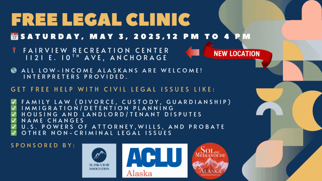 May Free Legal Clinic: On May 3, 2025, a free legal clinic for civil (non-criminal) legal issues was held in Anchorage. Interpreters were provided and all low-income people were welcome. Volunteer Attorneys provided free 30-minute consultations to 58 clients on issues such as immigration, family law, housing, U.S. powers of attorney, name changes, probate, and more. This clinic was sponsored by the Alaska Bar Association, ACLU of Alaska, and Sol de Medianoche. We hope to make this clinic an annual event.